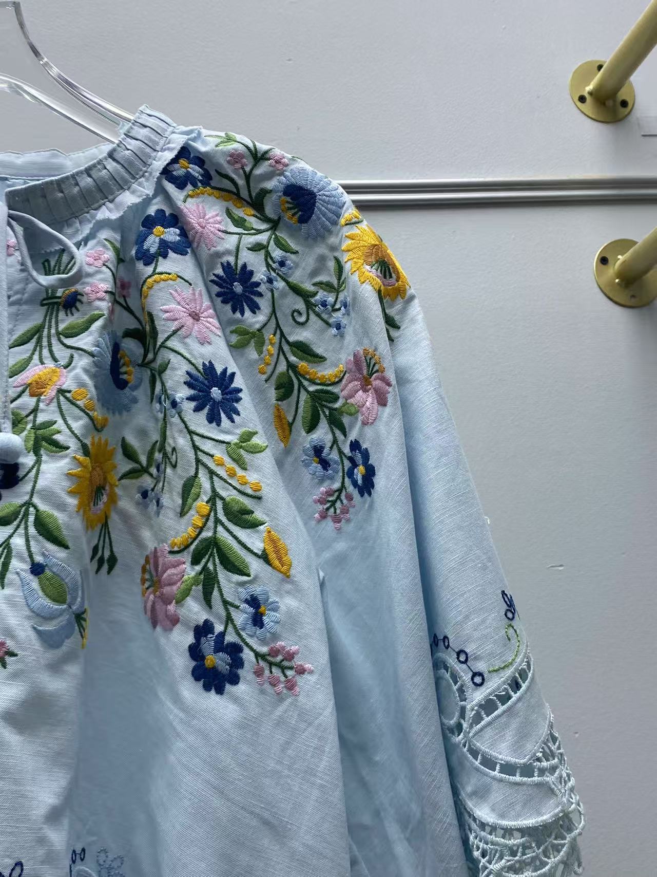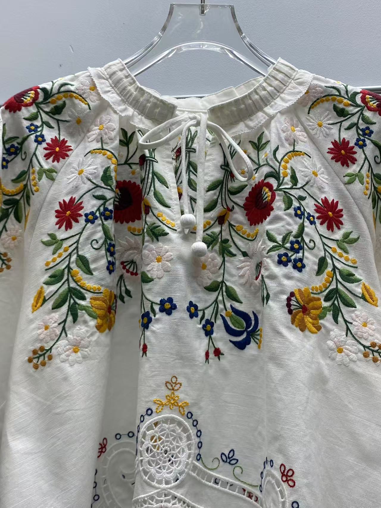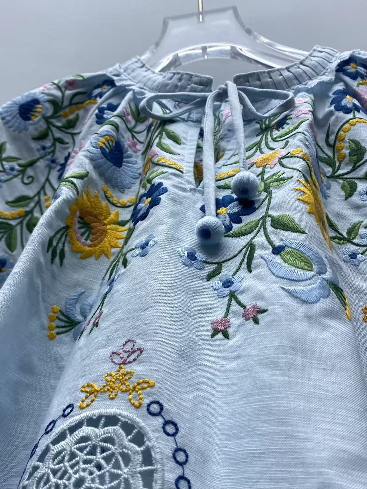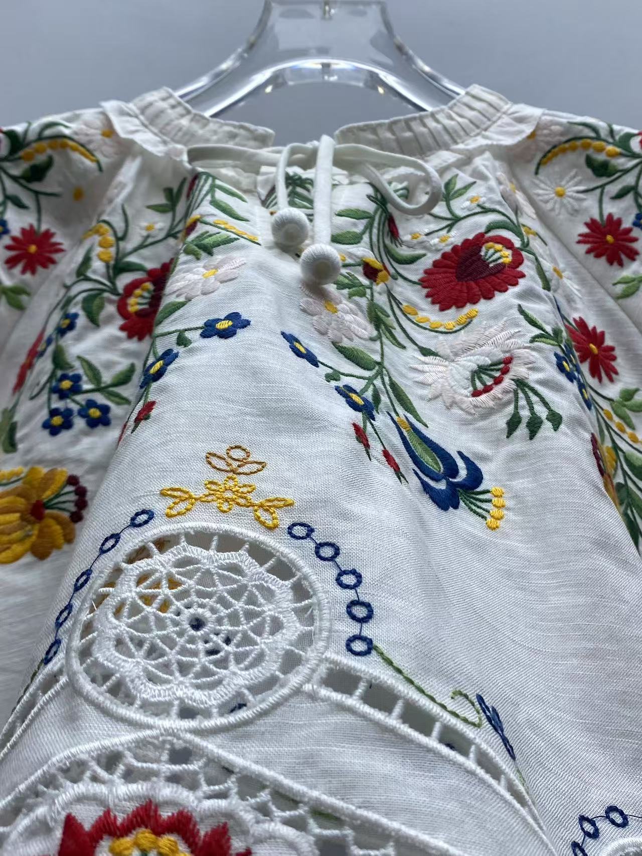 Embroidered Floral Hollow Out Tied Loose Round Neck Puff Sleeve Top