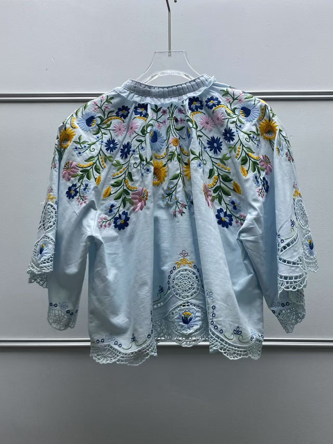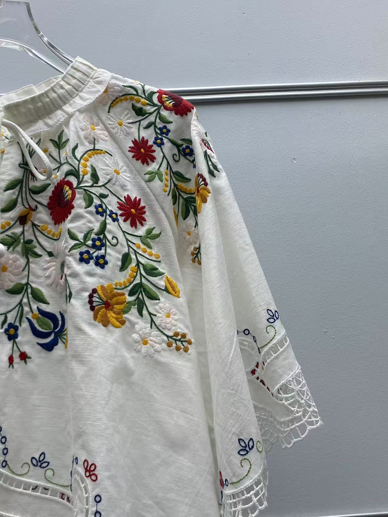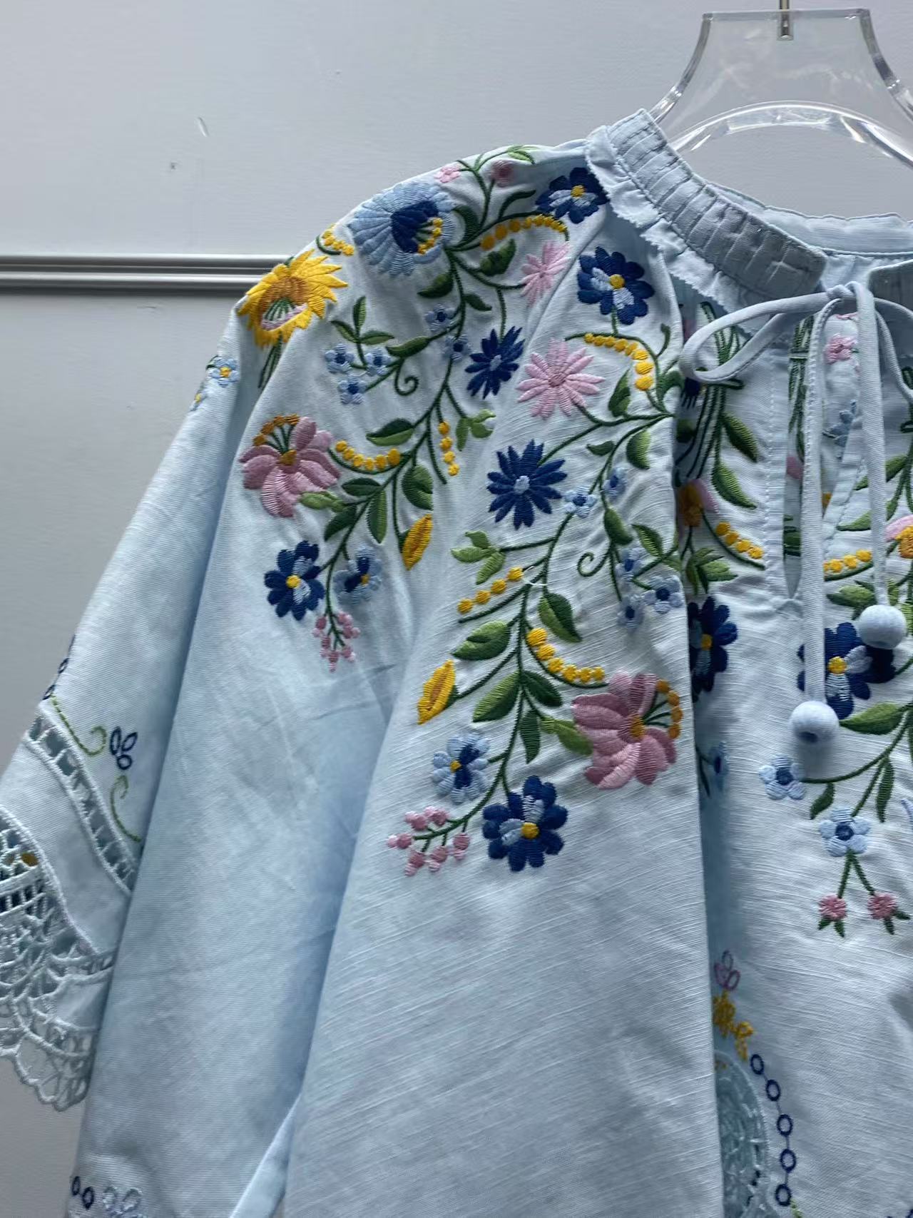 Embroidered Floral Hollow Out Tied Loose Round Neck Puff Sleeve Top