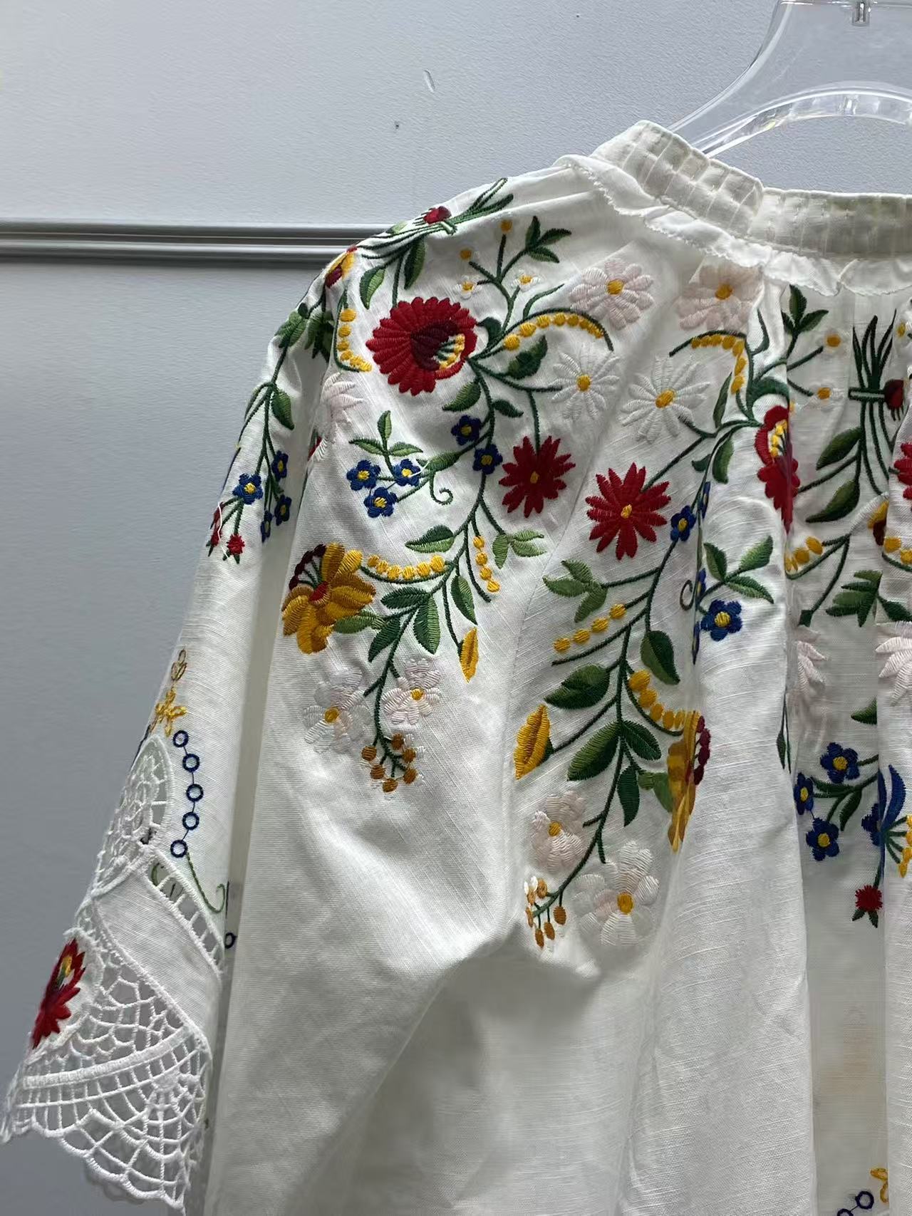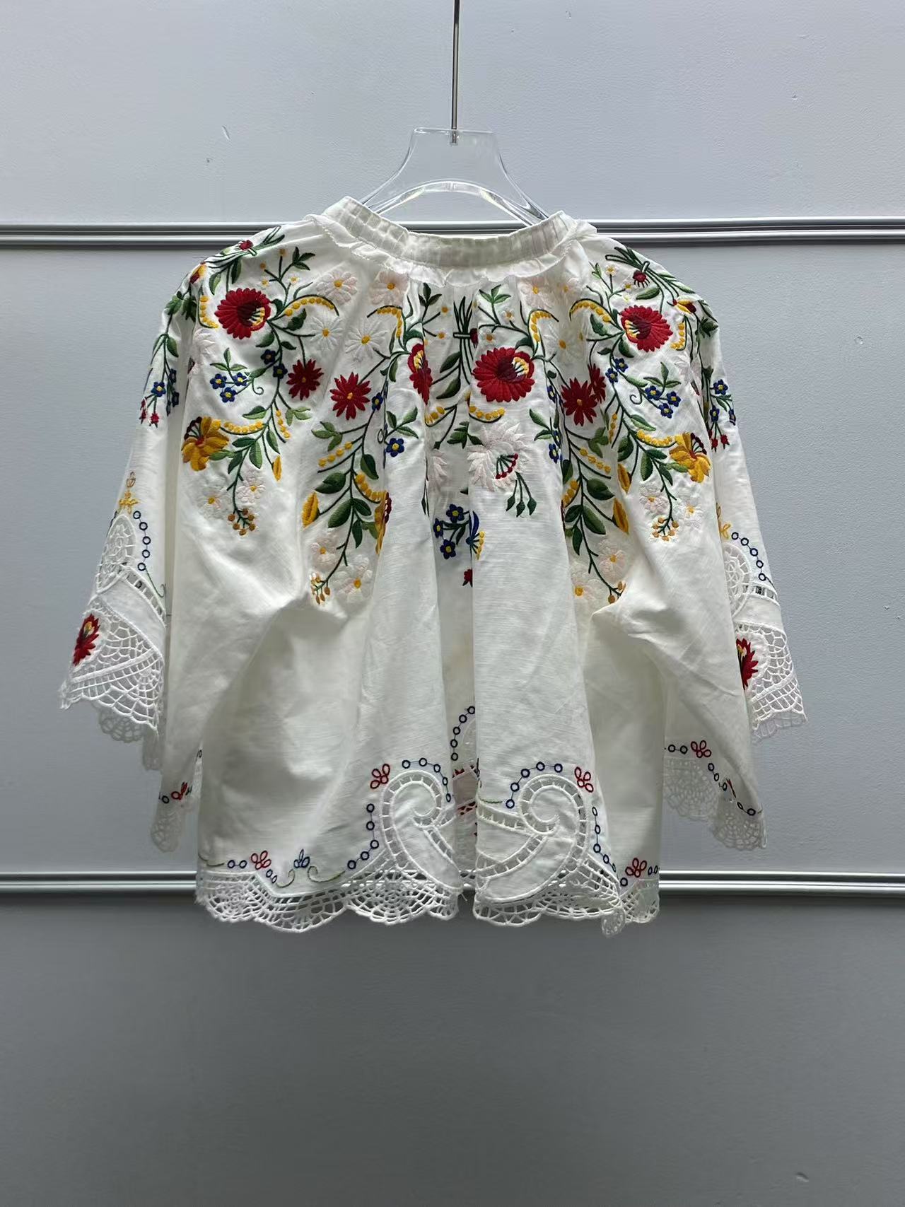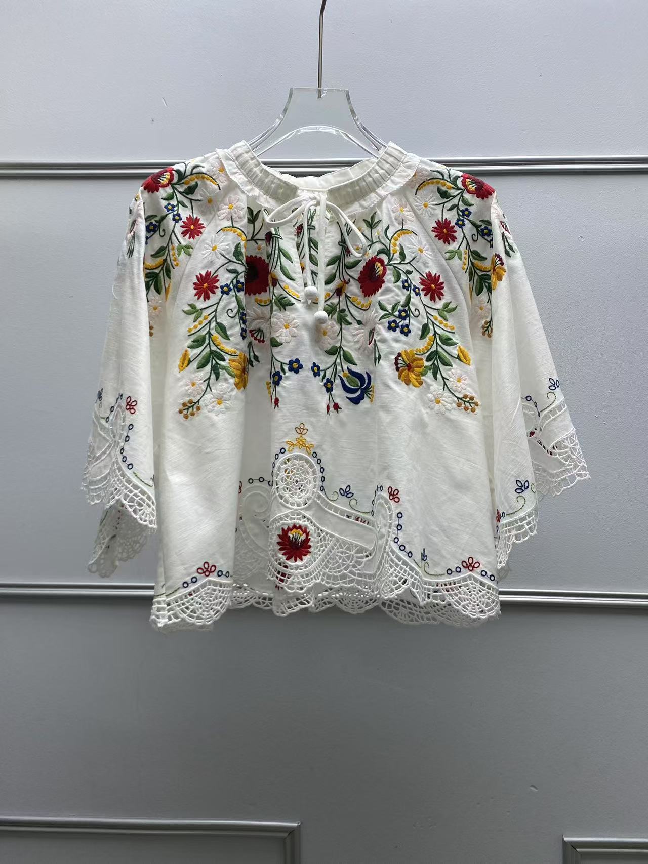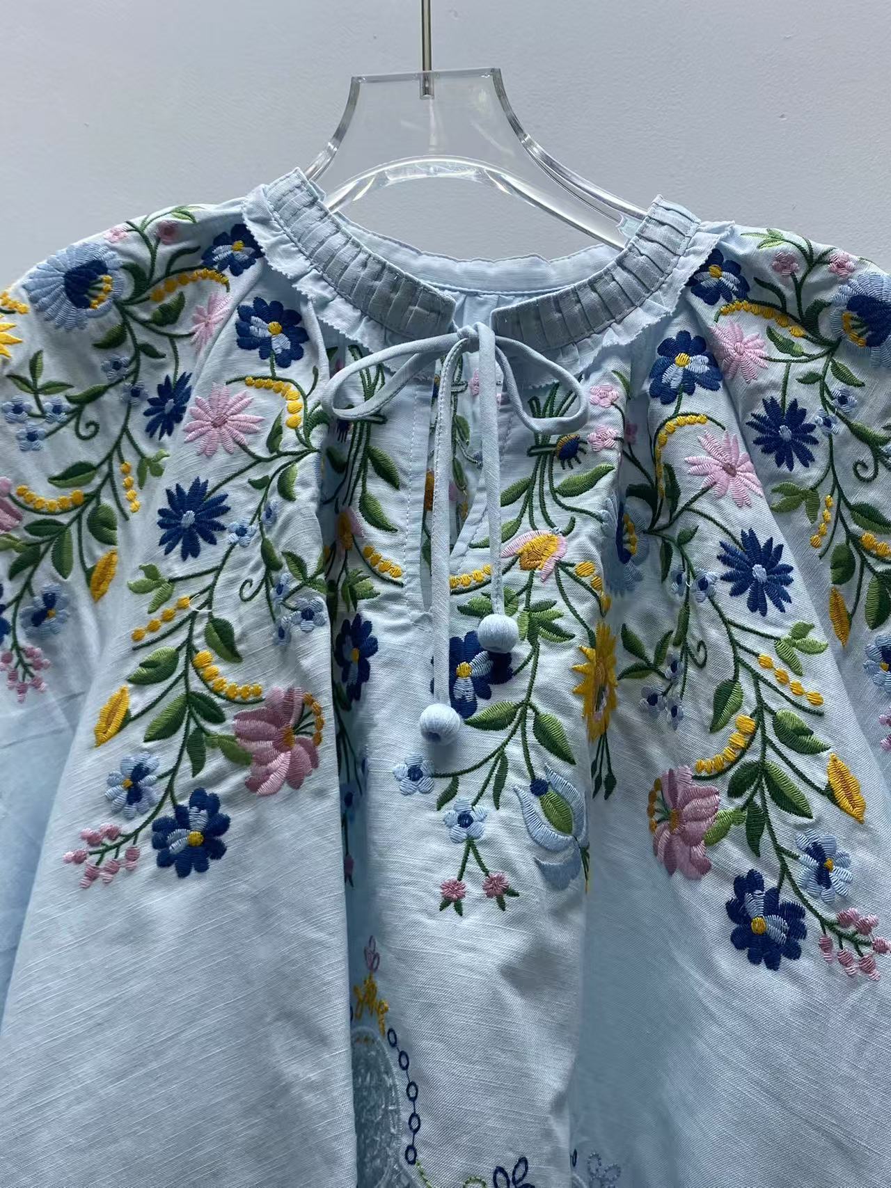 Embroidered Floral Hollow Out Tied Loose Round Neck Puff Sleeve Top