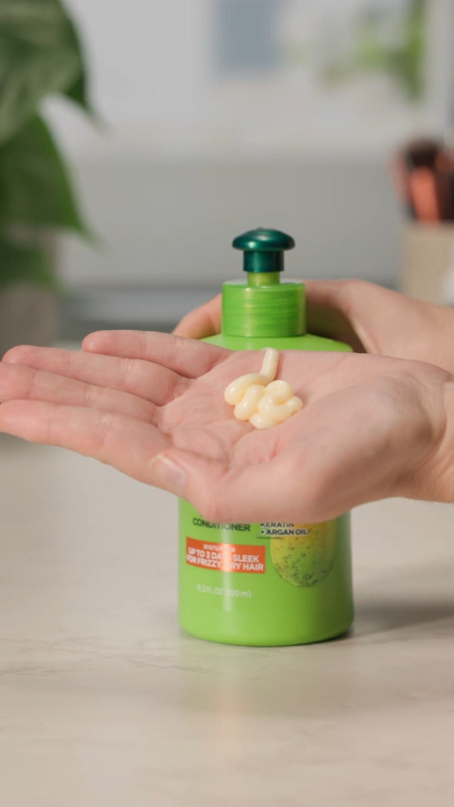 - Garnier Sleek and Shine Leave In Conditioner: Nourishing hair cream with argan oil penetrates into frizzy, dry hair to smooth each strand; Up to 3 days sleek and long lasting frizz control even in 97 percent humidity