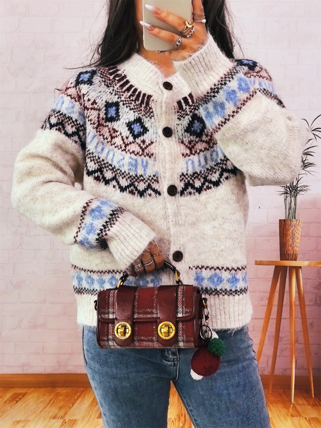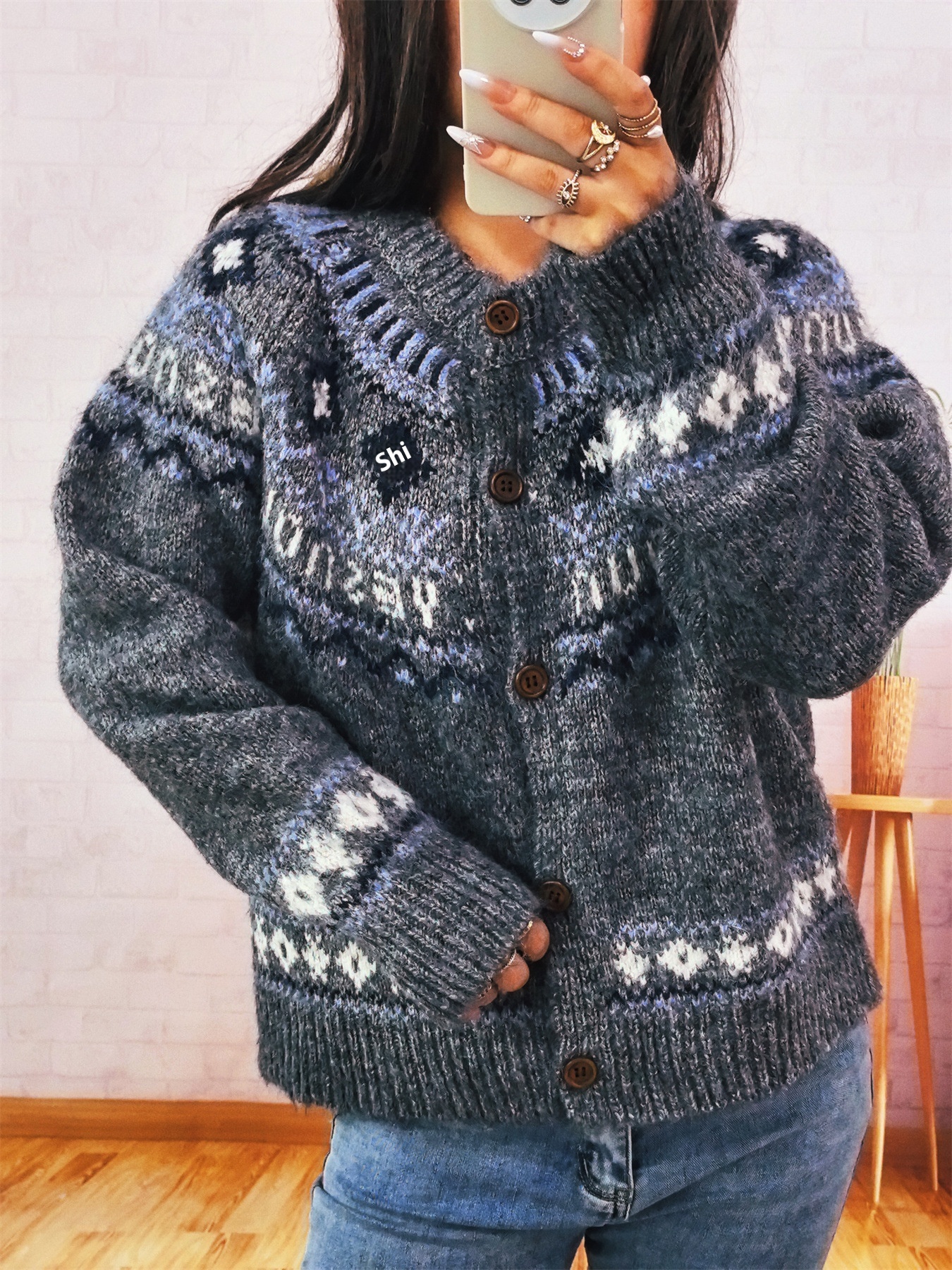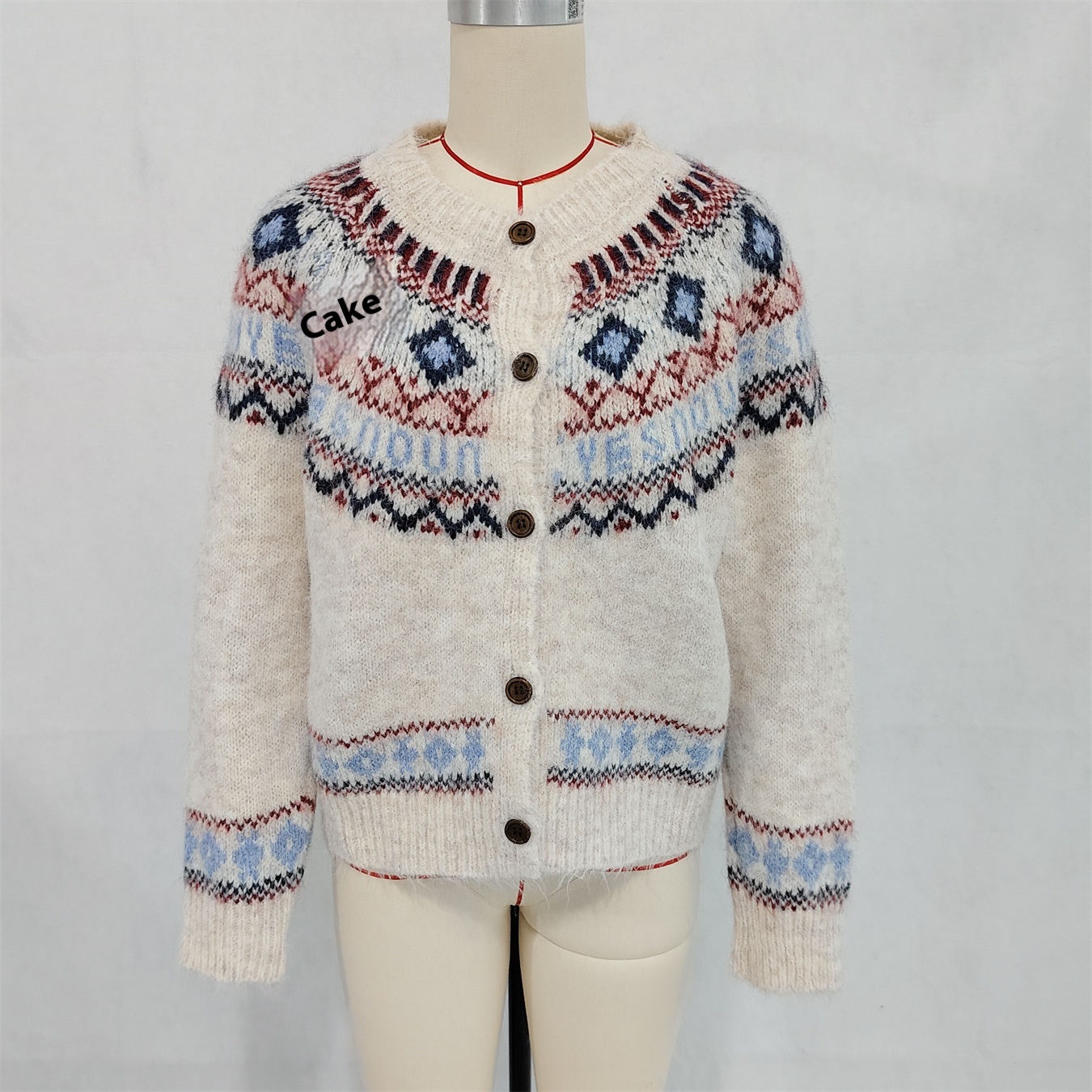 Retro Knitting Patterns Jacquard Fashion Round Neck Long Sleeve Coat For Women