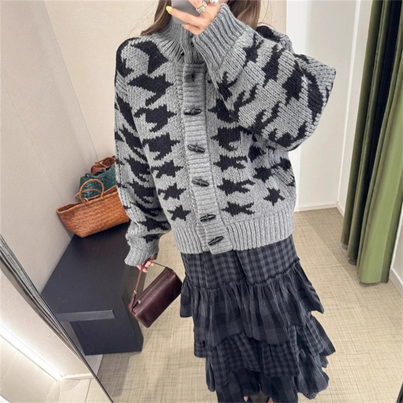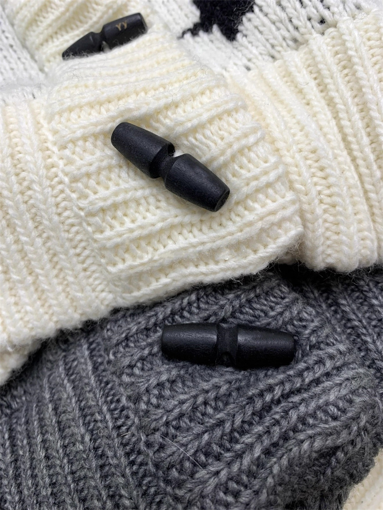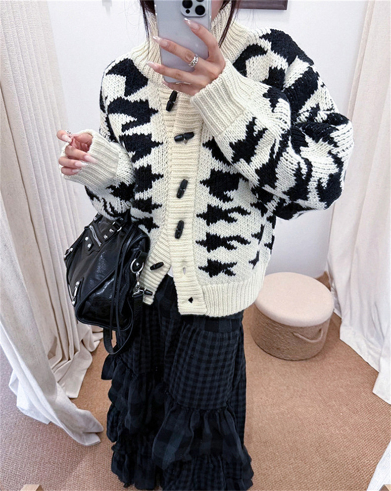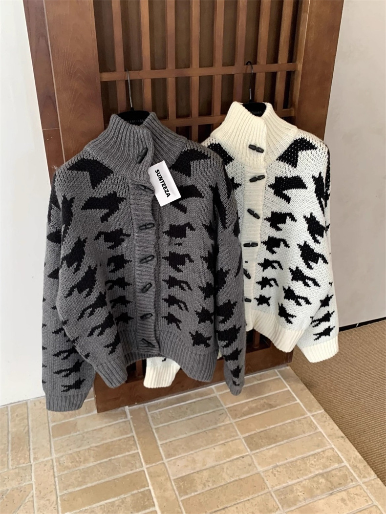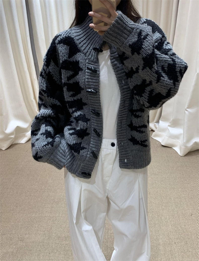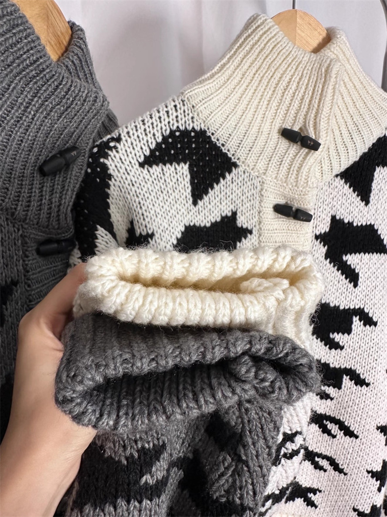 Stand-up Collar Jacquard Horn Button Sweater Coat